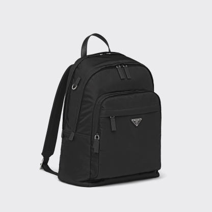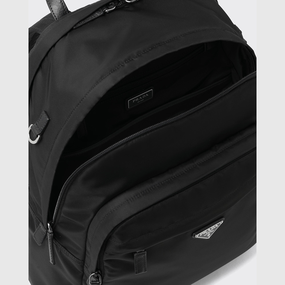 This roomy backpack with a technical look is made of Re-Nylon, the innovative technical fabric produced from recycled plastic trash recovered in the ocean. The design of the accessory, with main compartment with zipper closure, stands out for its Saffiano leather details. Saffiano leather, an iconic material of Prthtada, is synonymous with luxury and identifies with traditional Italian leather goods production. The calf leather of the highest quality is defined by a crosshatch pattern and wax finish.